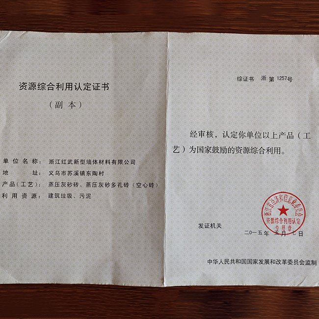 浙江紅武新型墻體材料有限公司成立于2013年,注冊資本1000萬元本公司有一般工業固體廢物回收利用服務。同年斥資3800萬元,購進德國技術裝備的液壓制磚設備,采用先進的生產工藝,生產各種規格型號蒸壓灰砂磚、蒸壓灰砂多孔磚、蒸壓灰砂空心砌塊等產品,年達1億塊蒸壓砂磚(折合標磚)。